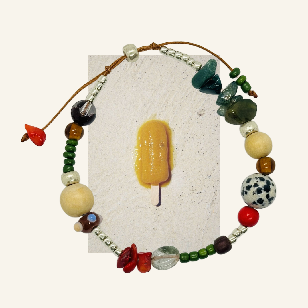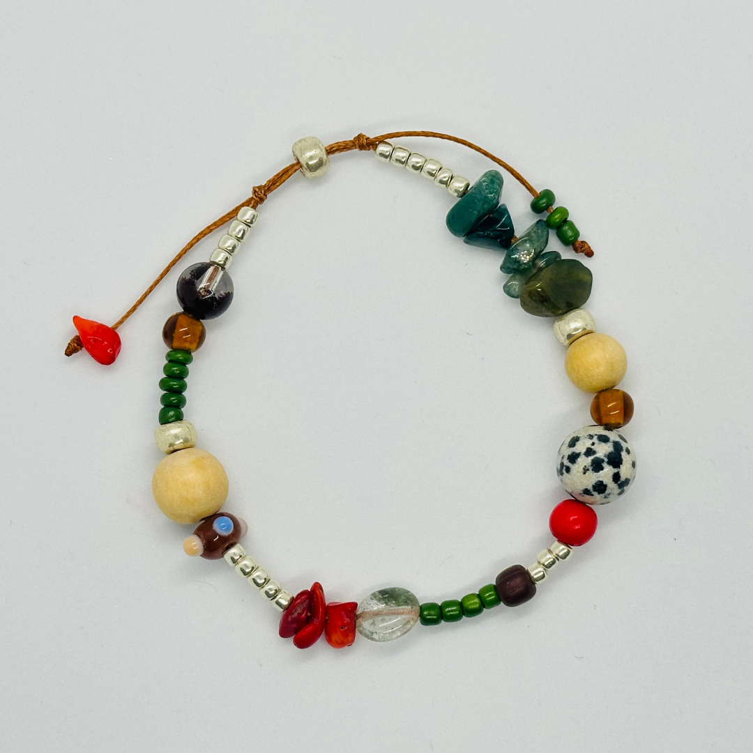 インド、ジャワ、アフリカ、ドイツ、チェコなど様々な国のビーズを使って作られたブレスレットです。