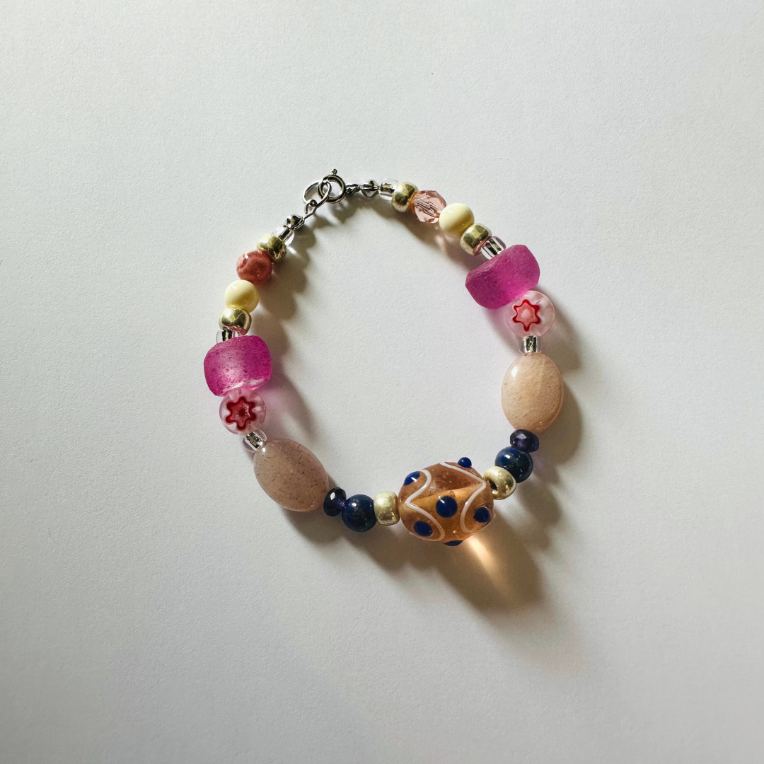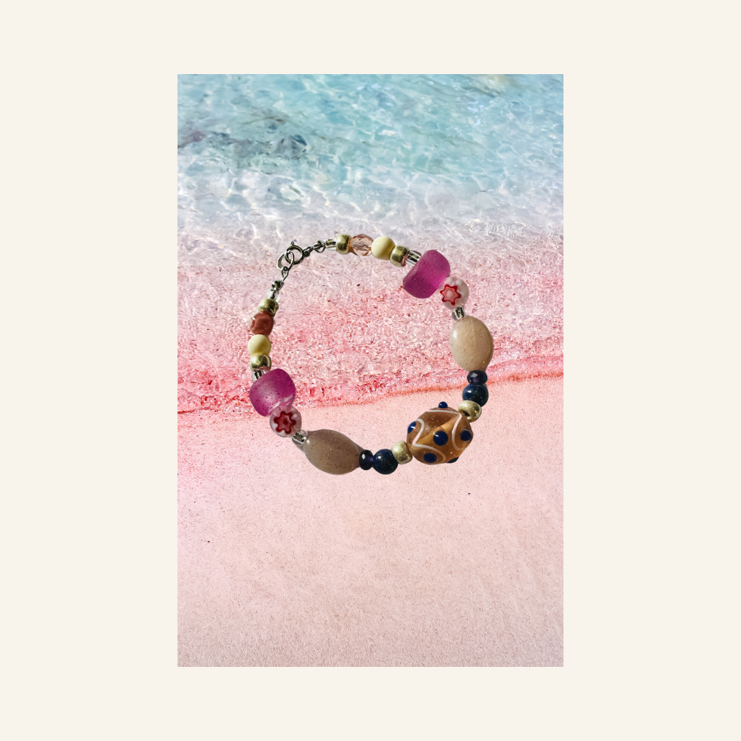 インド、アフリカ、ドイツ、チェコなど様々な国のビーズを使って作られたブレスレットです。