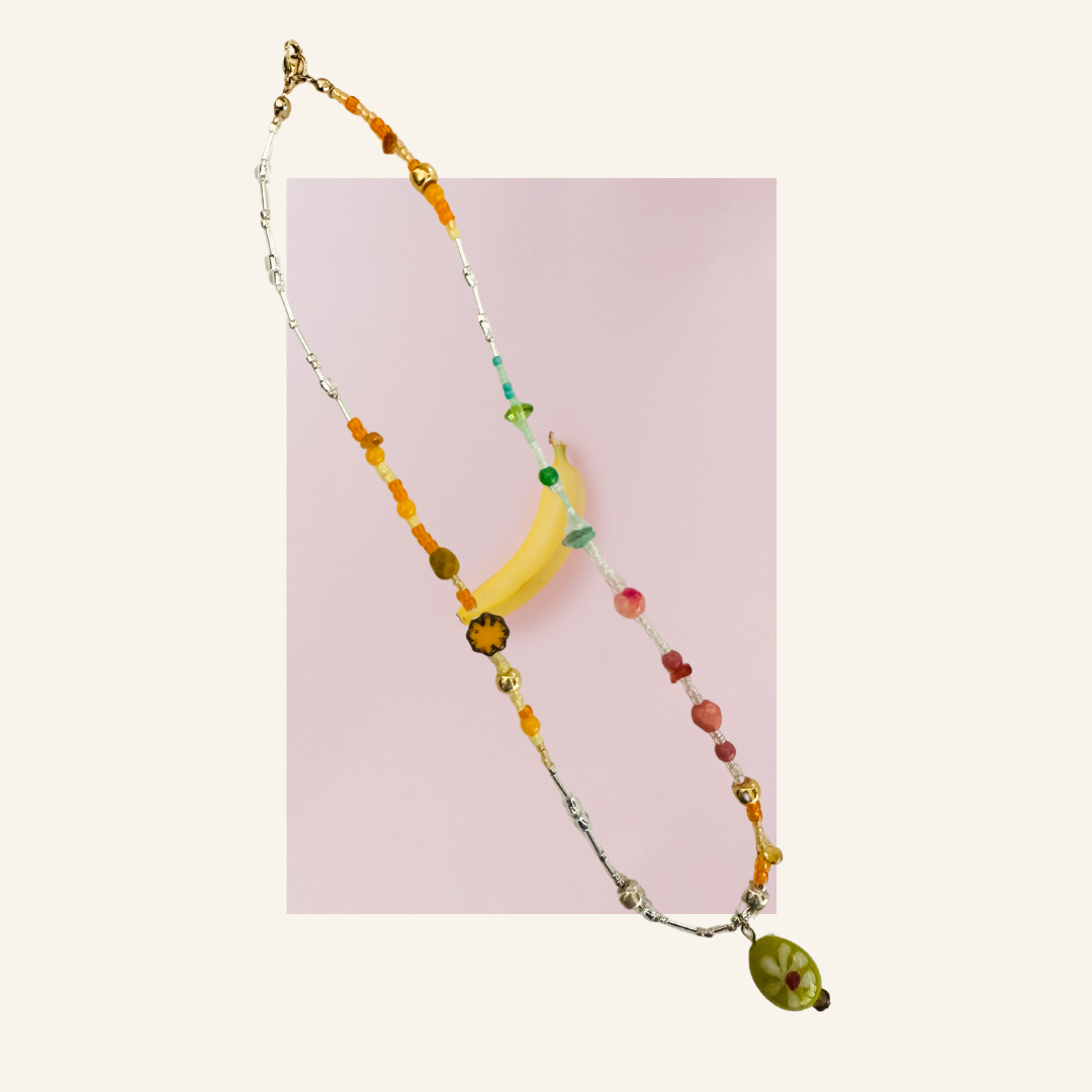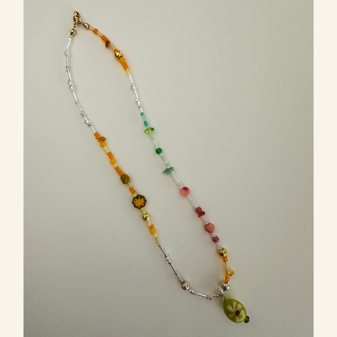 インド、ジャワ、アフリカ、ドイツ、チェコなど様々な国のビーズを使って作られたネックレスです。